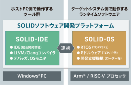 ソフトウェアプラットフォームSOLIDは、Arm®プロセッサまたはRISC-Vプロセッサで動作するリアルタイムOSであるSOLID-OSと、Windows®パソコン上で動作する統合開発環境SOLID-IDEから構成されます。